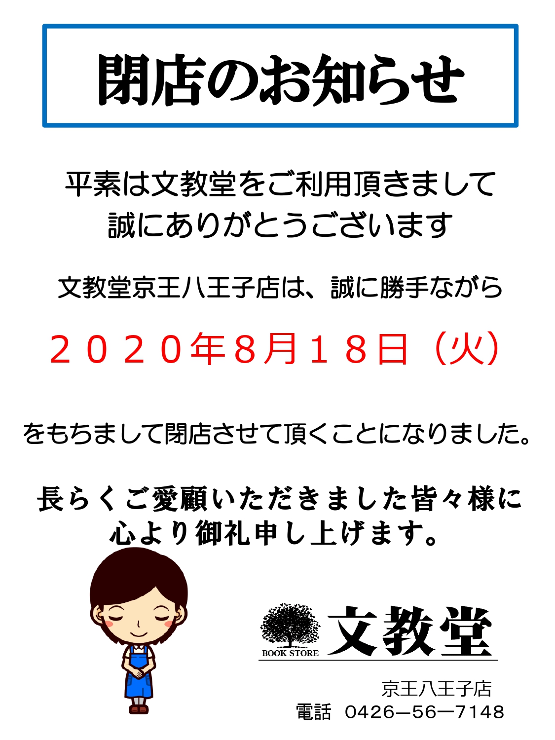 文教堂京王八王子店 重要なお知らせ 閉店のお知らせ いつも文教堂京王八王子店をご利用いただきまして誠に有難うございます このたび 京王八王子店 は年8月18日をもちまして閉店する運びとなりました 長きにわたりご愛顧頂きましたこと厚くお礼を